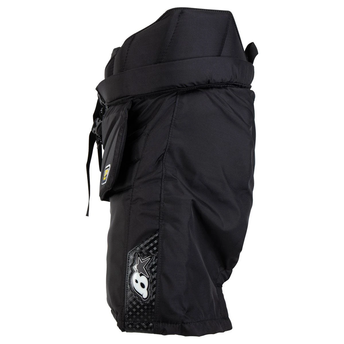 Looking at the Optik 2 Pants from the outside, you will notice the squared max coverage design that makes these pants appear large to the shooter while cutting down as much space as possible to save those extra in tight shots. Most noticeably, the thigh pads are designed to provide this max coverage and will create a tight seal of the five-hole and a seal to the post in an RVH situation. Up further on the hip flexor area on the Brian’s Optik 2 Pro Pants, you will see the squared frontal fins that are like the previous Optik pants model but slightly redesigned for more predictably rebounds and better overall protection.