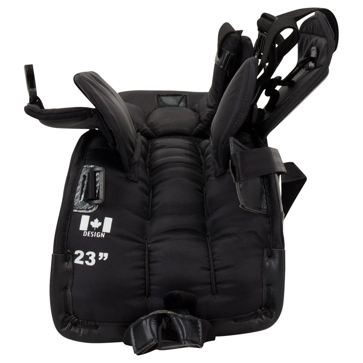 Flipping around to the inside of the NetZero 2, above the knee there is a provided tie in area made specifically for the Pro 2 Knee Pads to be attached physically to the leg pad. On the knee stack, a single Velcro strap is provided to be connected across the knee or angled down to a provided attachment area on the outside calf flap. Moving down to the calf area, Brian’s Smart Strap system is utilized to create a balanced strapping feel that is simple to attach. This strap is easily adjustable to give the goaltender their own preferred fit when using the NetZero 2. Over top of the calf, a webbing strap pulls the landing area to the goaltender’s leg an connects to the outside of the calf simply with a buckle.